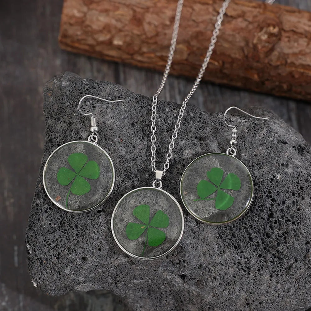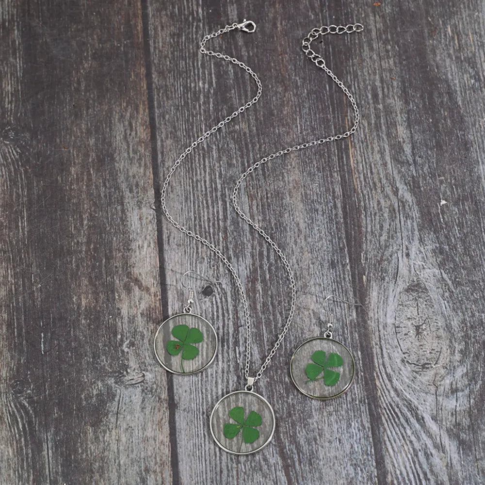 Lucky Clover Alloy Acrylic Earrings and Necklace Jewelry Set