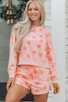 Pink Polka Dot Print Drop Shoulder Pullover Drawstring Shorts Set