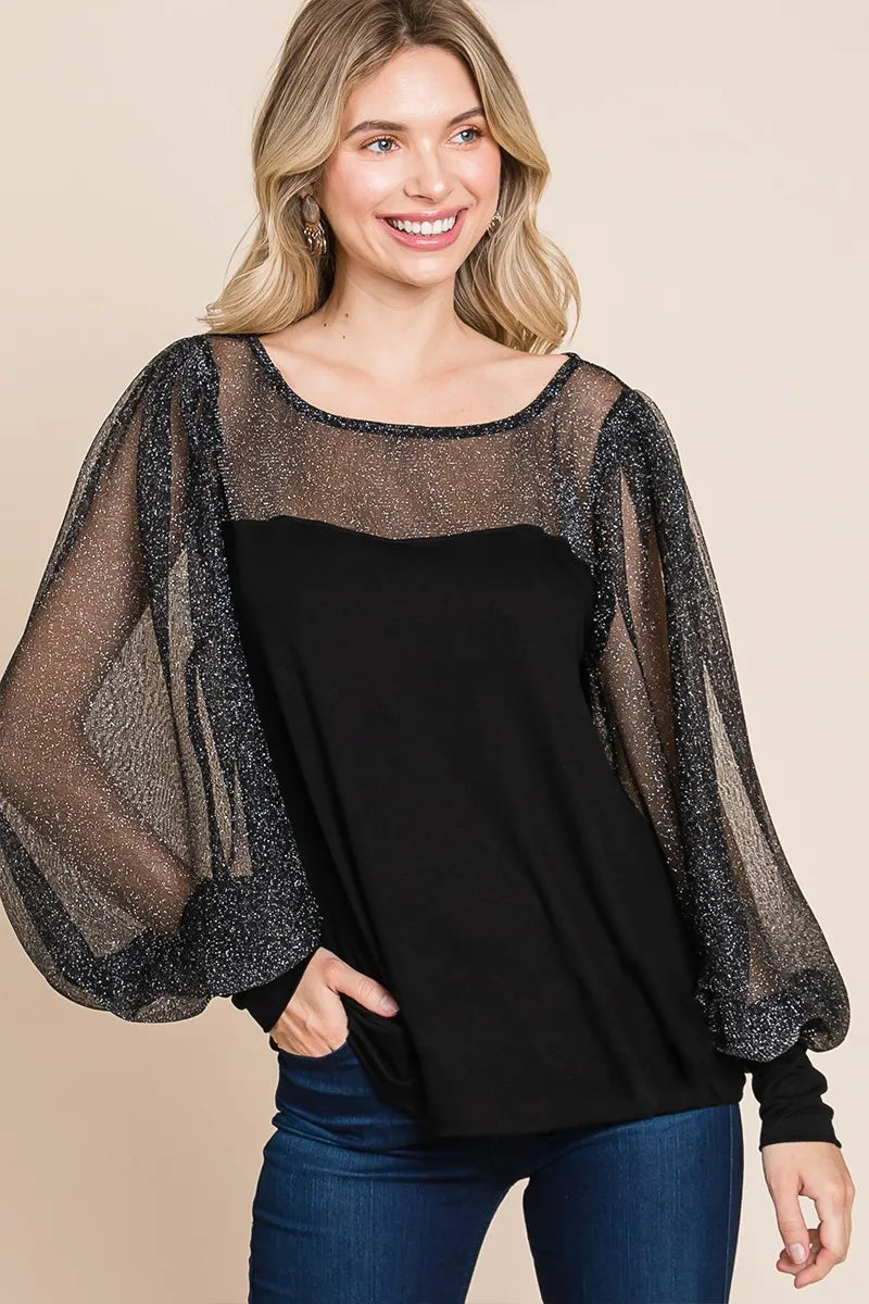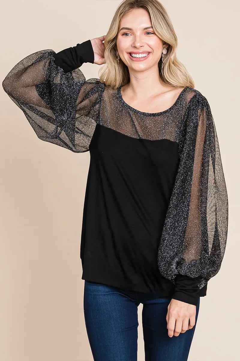 Super Lady Full Size Metallic Mesh Lantern Sleeve Blouse