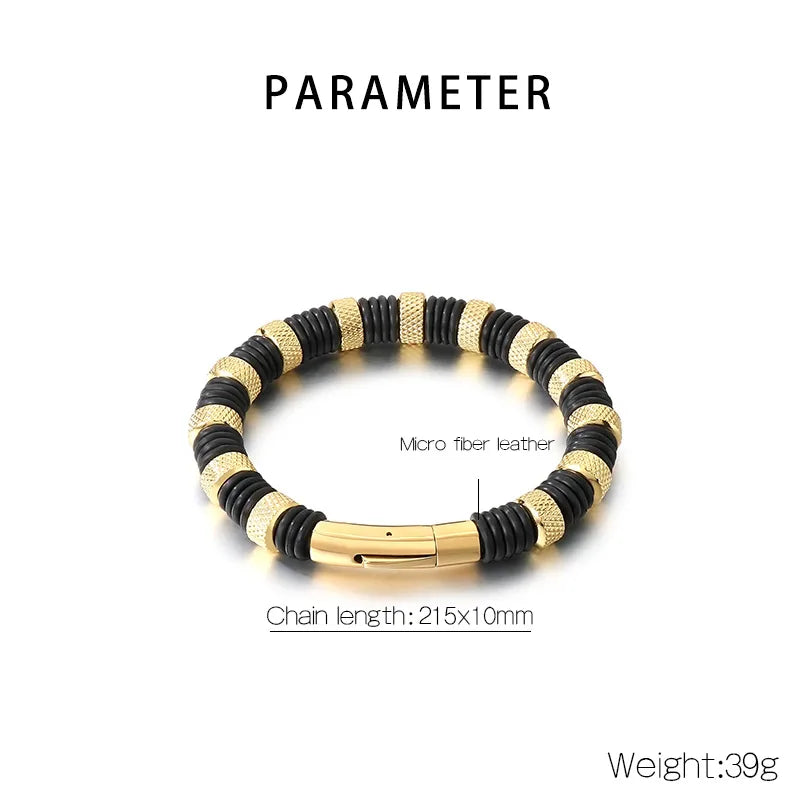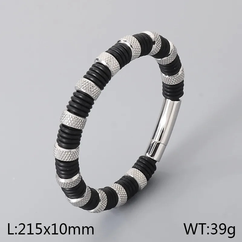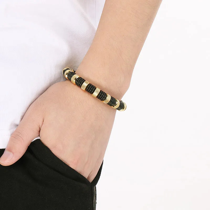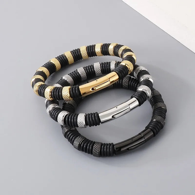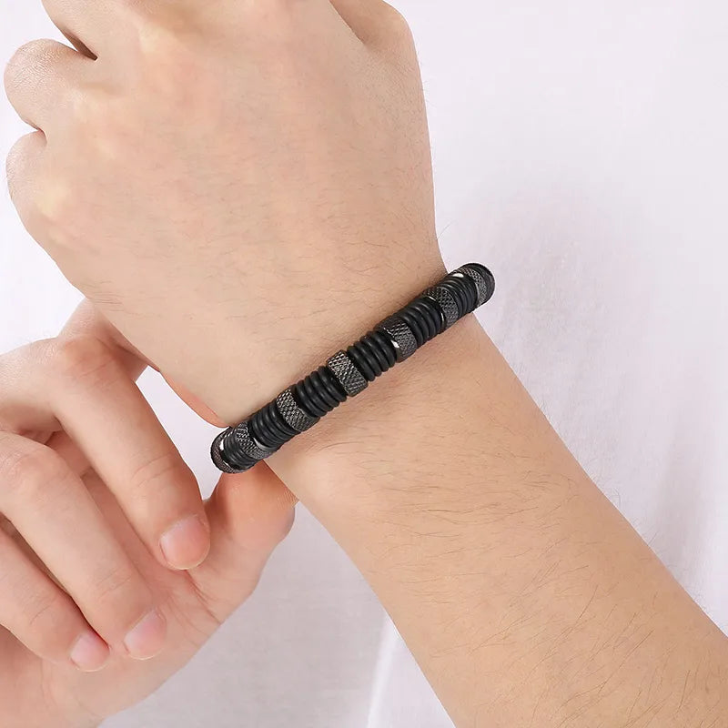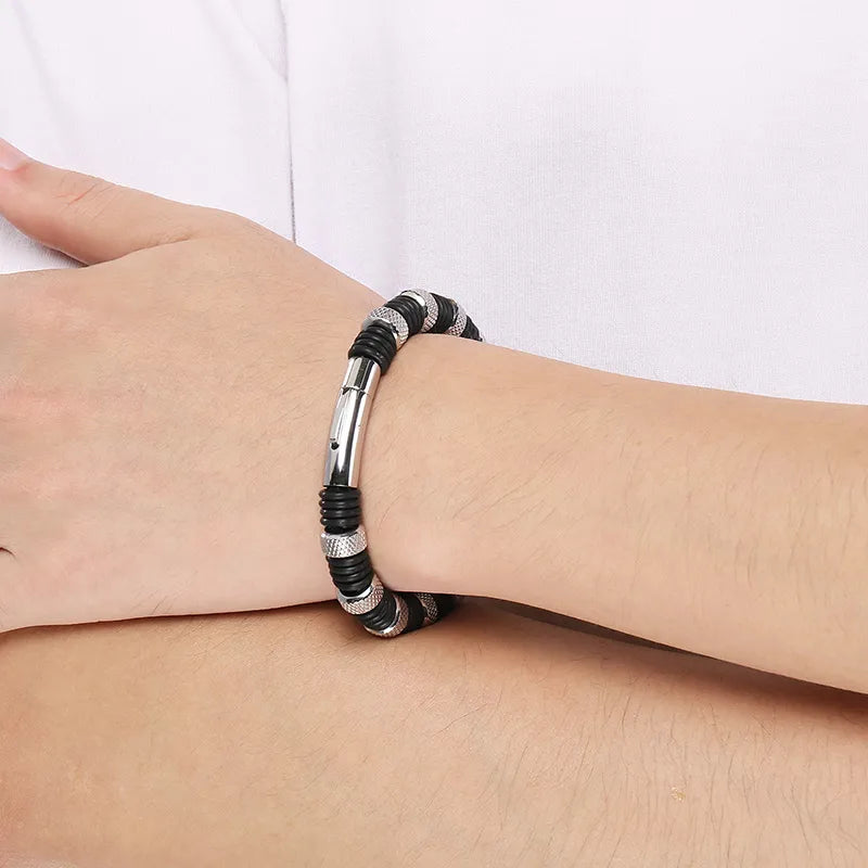 Men’s Stainless Steel Mesh Leather Bracelet with Round Beads