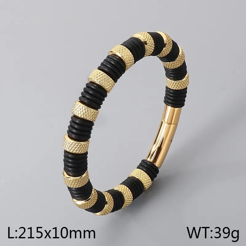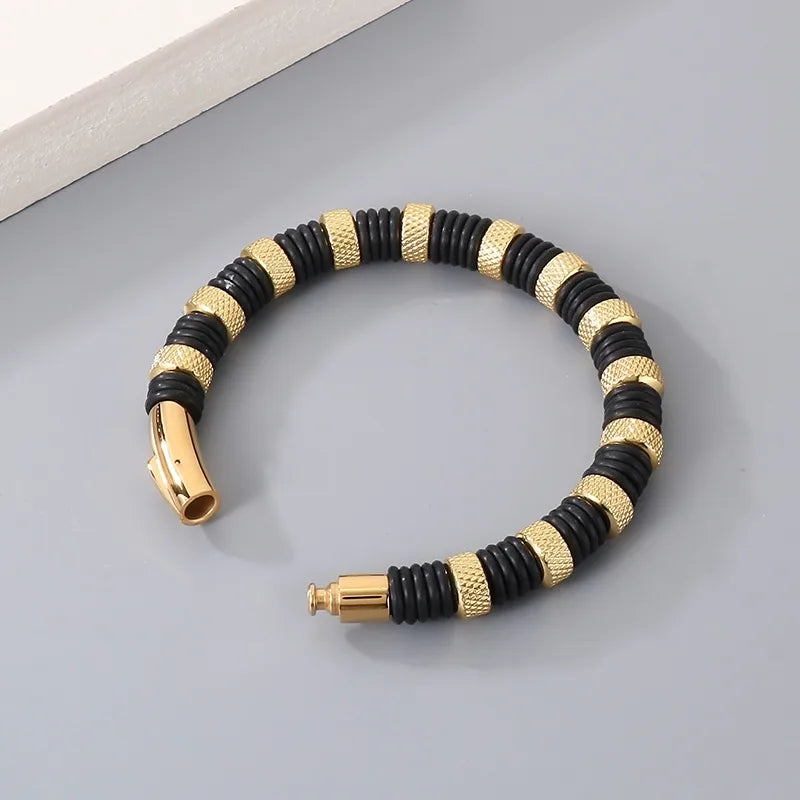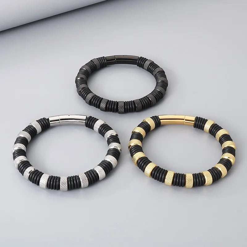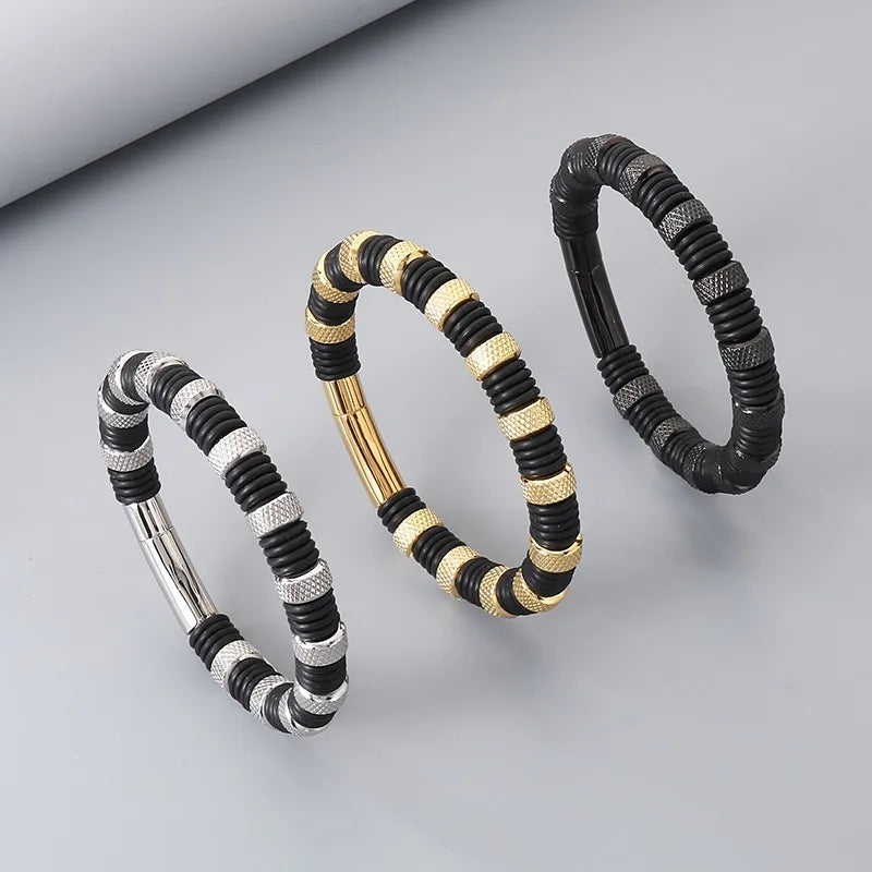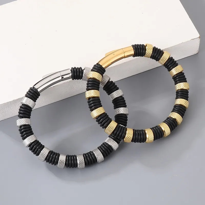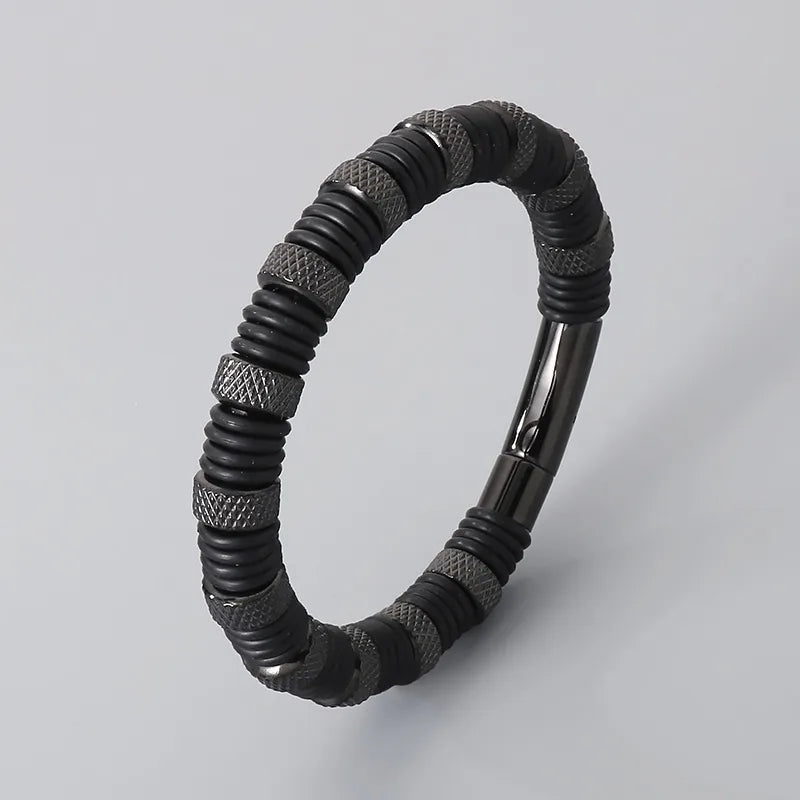 Men’s Stainless Steel Mesh Leather Bracelet with Round Beads