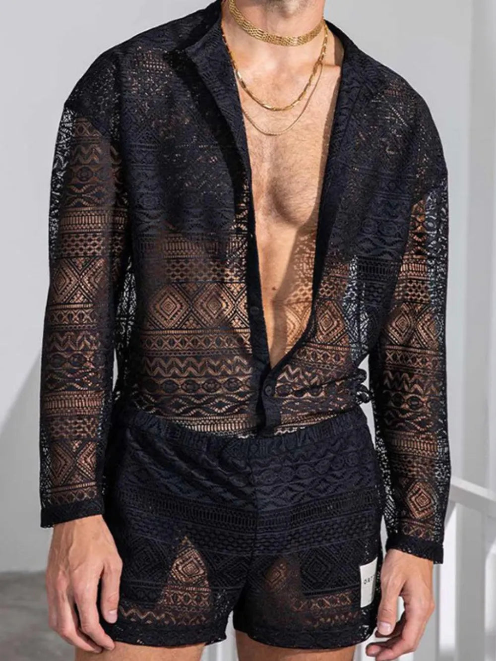 Men's Full Size Lace Button Down Top and Shorts Set Plus Size