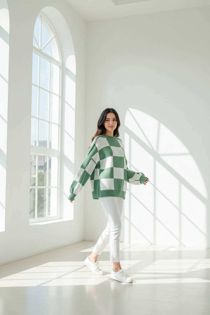 • Elevate your wardrobe with this stylish Checkered Bishop Sleeve Sweater