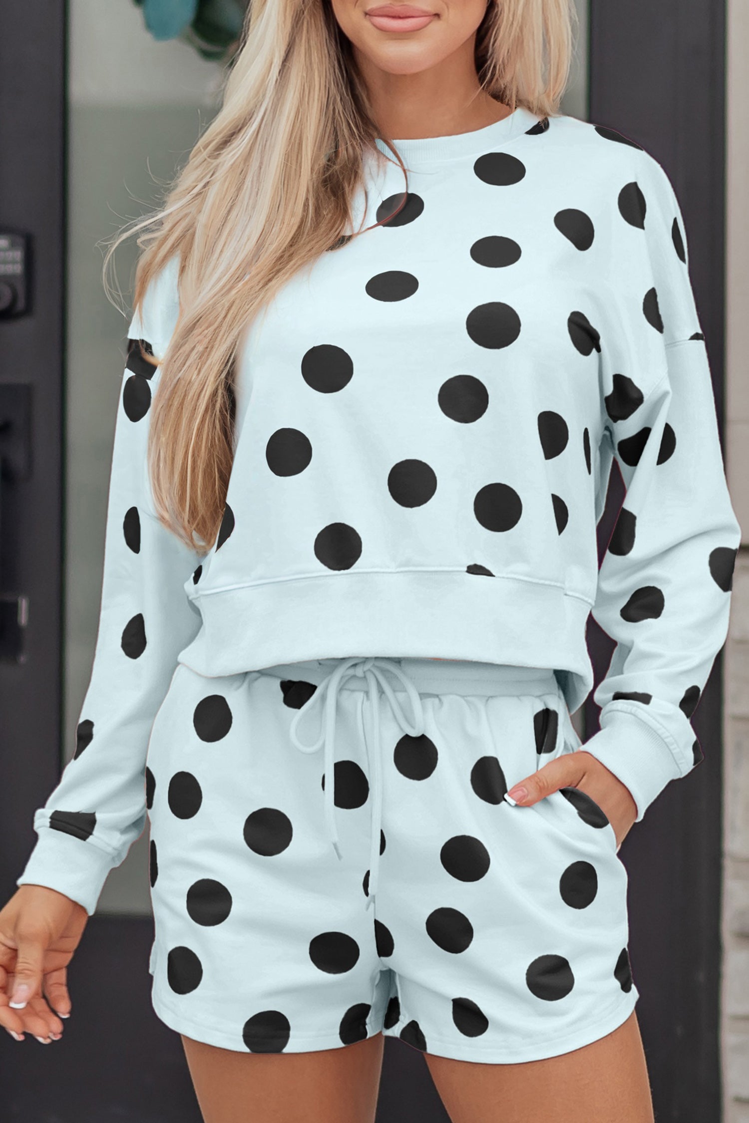 Pink Polka Dot Print Drop Shoulder Pullover Drawstring Shorts Set