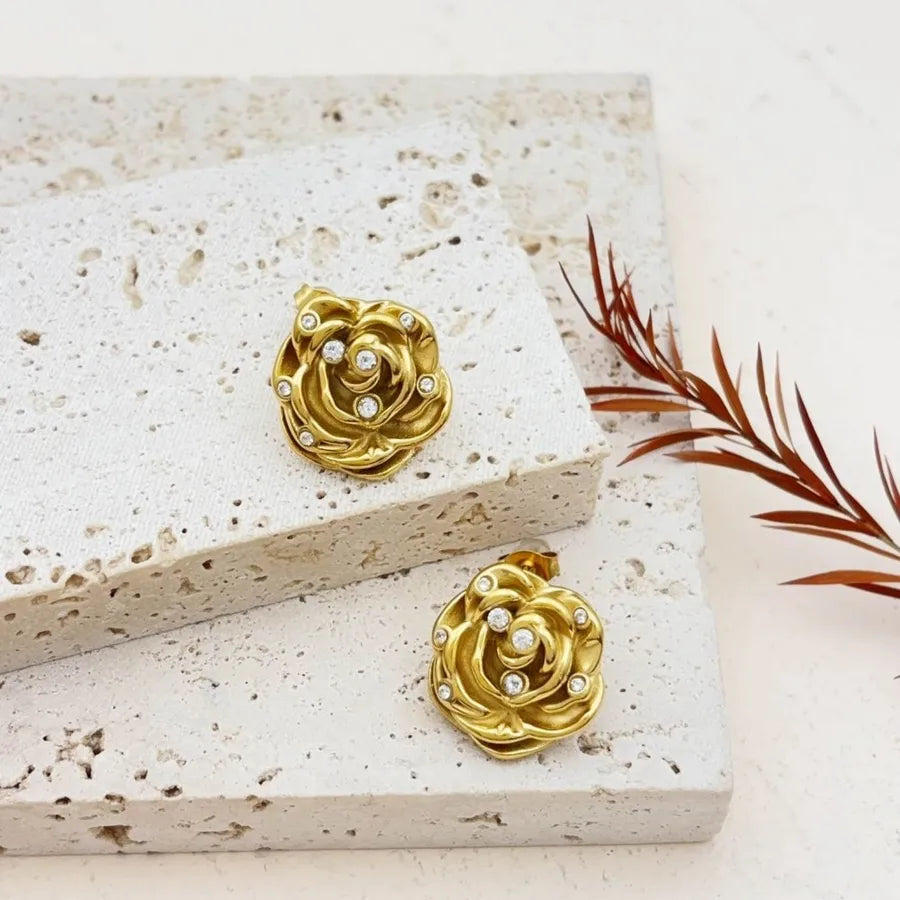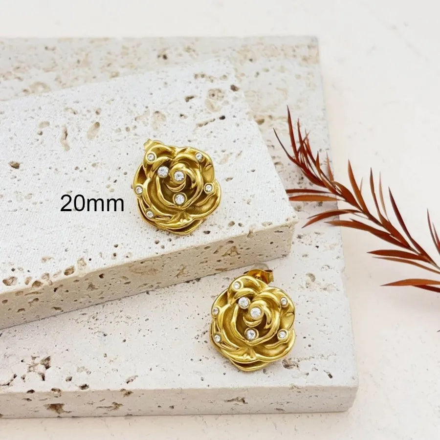 Stainless Steel 18K Real Gold Plated Zircon Flower Earrings
