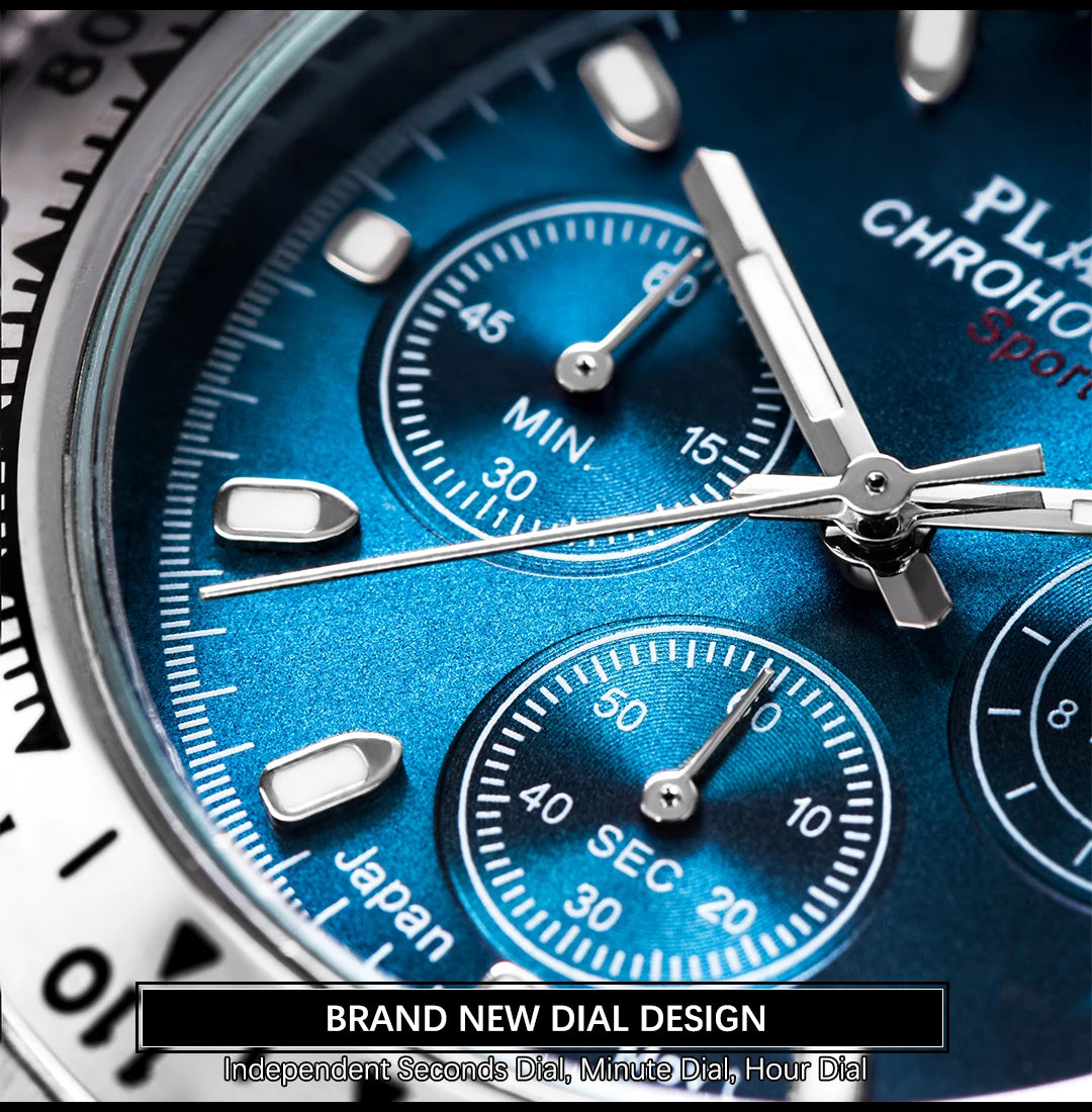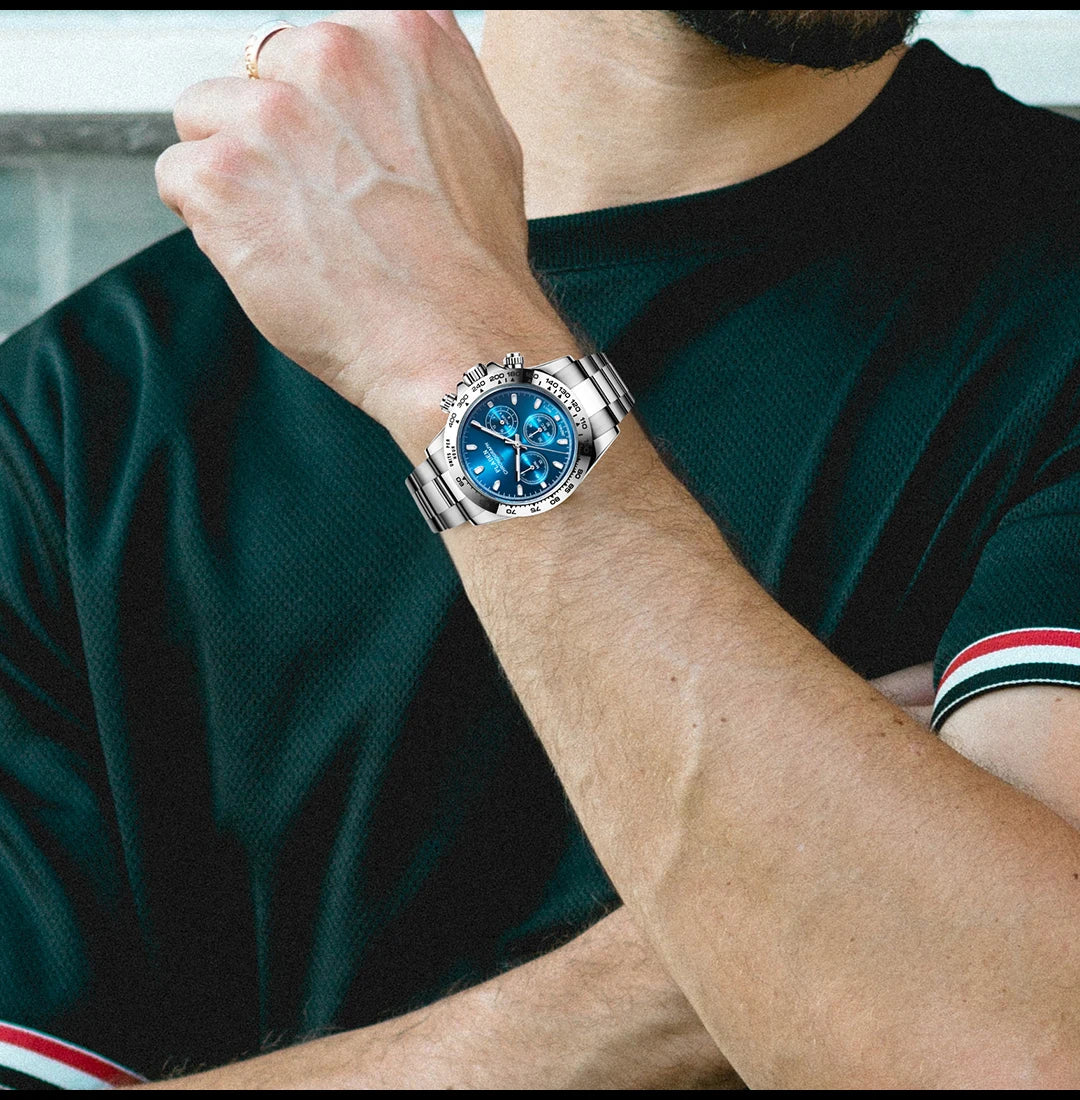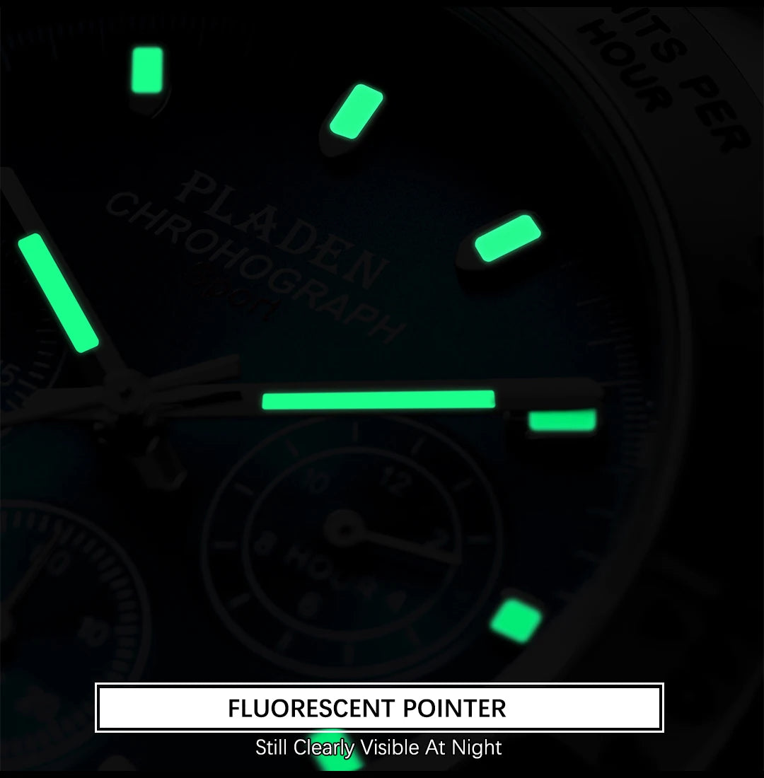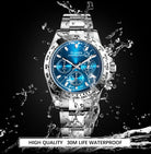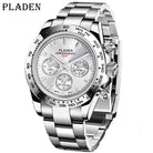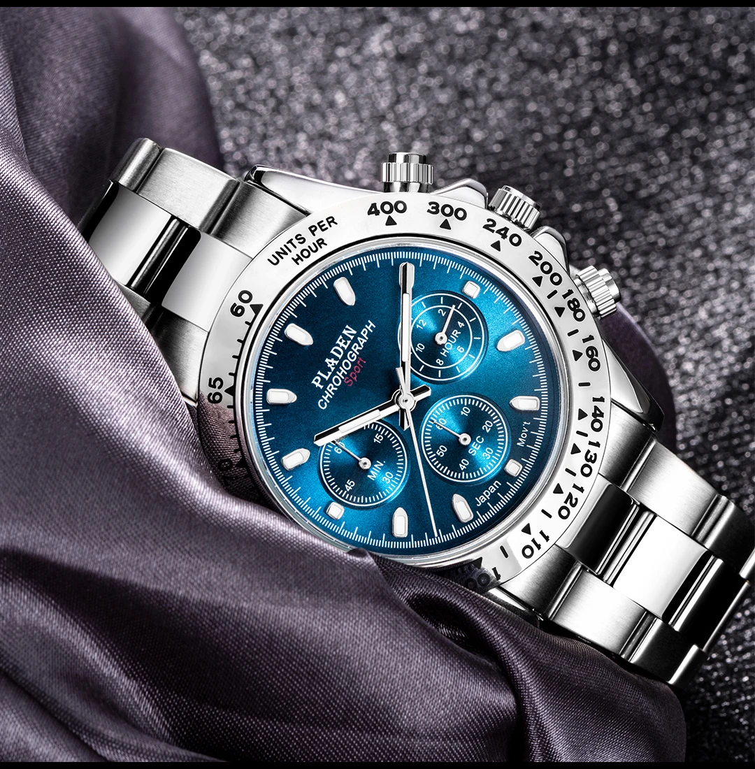 PLADEN Men Watches Luxury Full Stainless Steel Three Eye Male Quartz Wrist Watch Blue Dial Multifunctional Waterproof Mens Clock